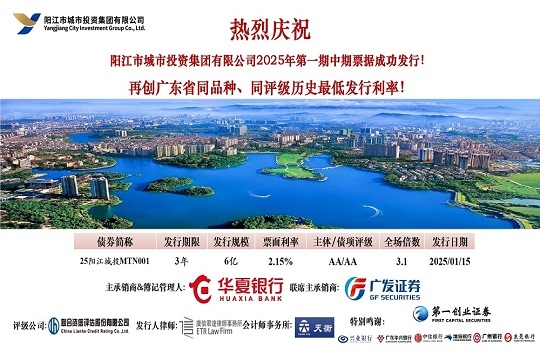 2025年1月15日,市城投集團(tuán)在中國銀行間交易商協(xié)會(huì)成功發(fā)行“陽江市城市投資集團(tuán)有限公司2025年第一期中期票據(jù)”。本期債券發(fā)行規(guī)模為6億元,期限為3年,票面利率2.15%,全場倍數(shù)超過3.1倍,合計(jì)申購機(jī)構(gòu)數(shù)23家。本期債...